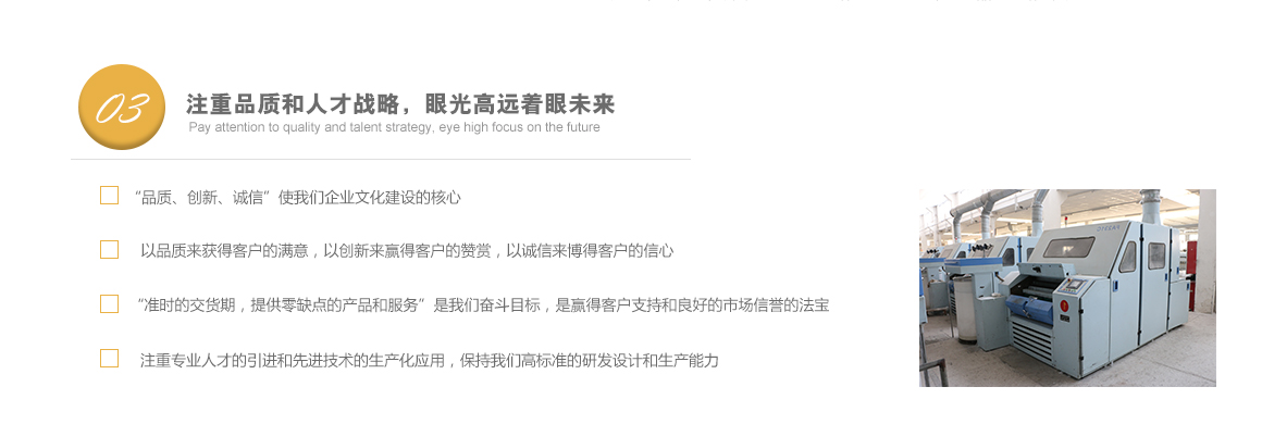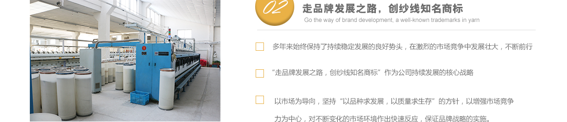 太倉市高陽工貿(mào)有限公司是專業(yè)從事特種紗生產(chǎn)十?dāng)?shù)年的一線生產(chǎn)廠家,坐落于江蘇省蘇州市太倉市雙鳳鎮(zhèn)新湖建湖路29號,太倉隸屬長江三角洲經(jīng)濟(jì)圈,交通便捷,經(jīng)濟(jì)發(fā)達(dá),是著名的紡織生產(chǎn)基地。 公司歷史要追溯到1982年就成立的新湖毛紡織廠。1996年,毛紡織廠與上海二十二棉在新湖聯(lián)合組建了太倉市新湖福利綜合廠。2002年為適應(yīng)市場的飛速變化,公司轉(zhuǎn)制重組更名為太倉市高陽工貿(mào)有限公司。同時(shí)公司適時(shí)調(diào)整生產(chǎn)經(jīng)營策略,調(diào)整產(chǎn)品品種結(jié)構(gòu),把生產(chǎn)特種紗作為主要發(fā)展方向,純棉、滌綸竹節(jié)紗是我們的主要產(chǎn)品。 公司多年來始終保持了持續(xù)穩(wěn)定發(fā)展的良好勢頭,在激烈的市場競爭中發(fā)展壯大,不斷前行。我們把“走品牌發(fā)展之路,創(chuàng)紗線知名商標(biāo)”作為公司持續(xù)發(fā)展的核心戰(zhàn)略。以市場為導(dǎo)向,堅(jiān)持“以品種求發(fā)展,以質(zhì)量求生存”的方針,以增強(qiáng)市場競爭力為中心,對不斷變化的市場環(huán)境作出快速反應(yīng),品牌戰(zhàn)略的實(shí)施。公司注重專業(yè)人才的引進(jìn)和先進(jìn)技術(shù)的生產(chǎn)化應(yīng)用,具備較強(qiáng)的研發(fā)設(shè)計(jì)和生產(chǎn)能力。 公司一直把“品質(zhì)、創(chuàng)新、誠信”作為企業(yè)文化建設(shè)的核心。以品質(zhì)來獲得客戶的滿意,以創(chuàng)新來贏得客戶的贊賞,以誠信來博得客戶的信心。我們把“準(zhǔn)時(shí)的交貨期,提供零缺點(diǎn)的產(chǎn)品和服務(wù)”作為奮斗目標(biāo),贏得了客戶的支持和良好的市場信譽(yù)。 高陽工貿(mào)有限公司愿與廣大客戶加強(qiáng)合作,共享信息,迎接挑戰(zhàn),共同發(fā)展。客戶需求。了解詳細(xì)>>